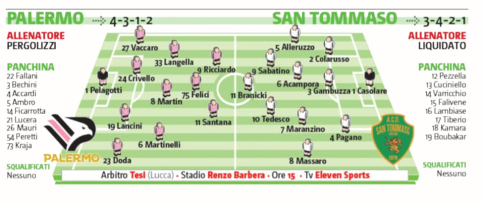 L’edizione odierna de “Il Giornale di Sicilia” analizza le probabili formazioni del match in programma oggi tra Palermo e San Tommaso. Potrebbe fare il suo esordio da titolare Mario Alberto Santana. Ecco in alto le potenziali scelte dei due tecnici.
