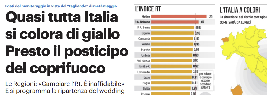 Gds: “I dati del monitoraggio in vista del “tagliando” di metà maggio. Quasi tutta Italia si colora di giallo. Presto il posticipo del coprifuoco”