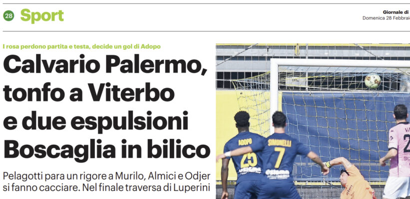 L’edizione odierna del “Giornale di Sicilia” fa il punto della situazione sul match di ieri contro la Viterbese. I rosa sono apparsi nervosi e mai pericolosi. La squadra di Boscaglia ha terminato il match in 9 complici le espulsioni di Odjer e Almici, adesso la lotta playoff si fa dura. Lo stesso tecnico gelese ha pagato la confusione di questa stagione, non ha trovato una formazione tipo, cambiando praticamente sempre l’undici di partenza e non ottenendo risultati. Adesso la dirigenza vuole imprimere una svolta alla stagione ed ecco l’esonero di Boscaglia.