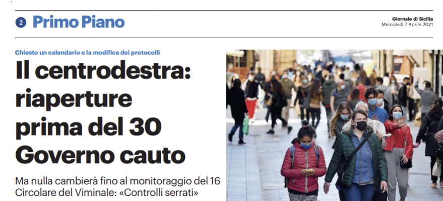L’edizione odierna del “Giornale di Sicilia” si sofferma sulla richiesta di riapertura dal 30 aprile avanzata dal Centrodestra.