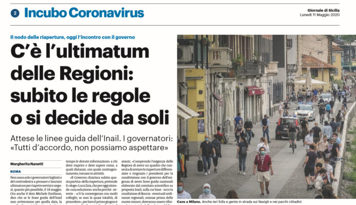 L’edizione odierna del “Giornale di Sicilia” si sofferma sull’incontro tra Stato e Regioni. I governatori richiedono riaperture il prima possibile. Come presidente della Conferenza delle Regioni, Bonaccini fa presente di aver ricevuto «da tanti suoi colleghi la richiesta di avere certezza che dal 18 maggio possano riaprire gli esercizi e le attività commerciali oggi chiuse, ovviamente sulla base dell’andamento epidemiologico e il rispetto di protocolli di sicurezza condivisi». Boccia ha rassicurare che «dal 18 ci sarà una nuova fase, che porterà a una differenziazione territoriale».