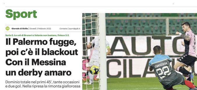 Gds: “Il Palermo fugge, poi c’è il blackout. Con il Messina un derby amaro”
