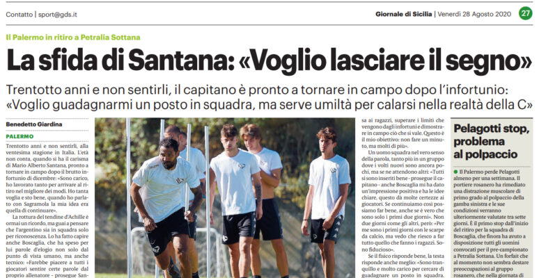 L’edizione odierna del “Giornale di Sicilia” riporta le dichiarazioni di Mario Alberto Santana, direttamente dal ritiro di Petralia Sottana: