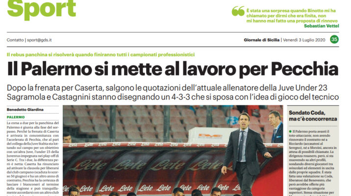 Gds: “Il Palermo si mette al lavoro per Pecchia. Sagramola e Castagnini stanno disegnando un 4-3-3 che si sposa con l’idea di gioco del tecnico”
