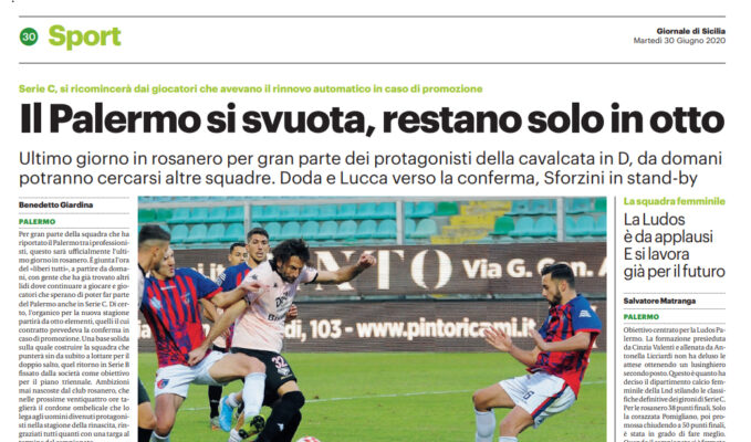 L’edizione odierna del “Giornale di Sicilia” parla di un Palermo che si svuota. A partire da domani, scadranno infatti tutti i contratti annuali stipulati tra i dilettanti. L’organico ripartirà da soli 8 elementi, quelli che sarebbero stati confermati automaticamente in caso di promozione: Pelagotti, Accardi, Crivello, Lancini, Martin, Martinelli, Santana e Floriano. Gli under Doda e Lucca,hanno la sicurezza di un posto al fianco degli otto «big» nel gruppo che si riunirà ad agosto a Petralia Sottana per il ritiro pre-campionato.