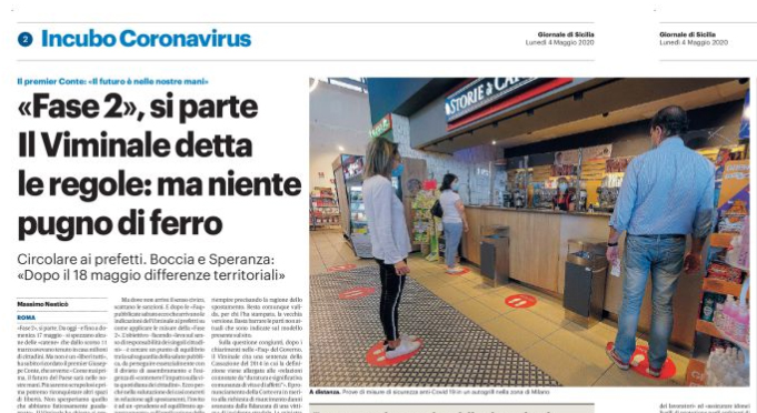 L’edizione odierna del “Giornale di Sicilia” si sofferma sull’inizio della Fase 2. Il Viminale ha chiesto ai prefetti un’applicazione «prudente ed equilibrata» delle misure: l’obiettivo primario è tutelare la salute, allentando però l’impatto delle prescrizioni sulla vita quotidiana. Si punta a colpire gli assembramenti di persone. Occhi puntati sul comportamento degli italiani e sulla curva dei contagi nelle prossime due settimane. «Sicuramente – osserva Speranza – il primo passaggio è quello del 18 maggio. Poi ci saranno altre scadenze, però noi vogliamo accelerare il più possibile ed il metodo di monitoraggio che abbiamo costruito sulle regioni ci consentirà anche di differenziare perché io credo che a un certo punto sia giusto immaginare di aprire di più i territori che sono più pronti e di avere più cautela in territori meno pronti». «Dopo il 18 o nella settimana successiva ci saranno differenze territoriali, ogni regione potrà fare alcune cose in funzione della sicurezza che ha costruito» conferma il ministro per gli Affari regionali, Francesco Boccia.