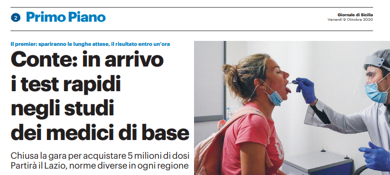 L’edizione odierna del “Giornale di Sicilia” parla dell’arrivo di 5 milioni di test rapidi antigenici per la diagnosi di positività al SarsCov2 negli studi dei medici di famiglia, dove il cittadino potrà effettuare l’esame ed avere il risultato entro un’ora.