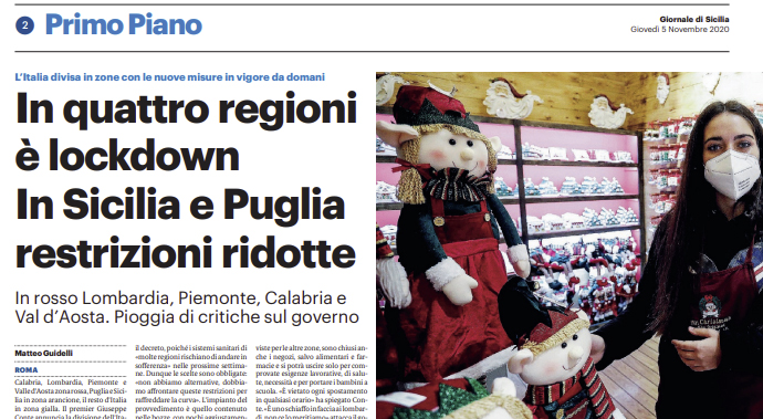 Gds: “In quattro regioni è lockdown. In Sicilia e Puglia restrizioni ridotte. Le reazioni a Palermo. Micciché «Conte ha deciso di farci morire». Il Pd «Tutta colpa di una Regione incapace»”