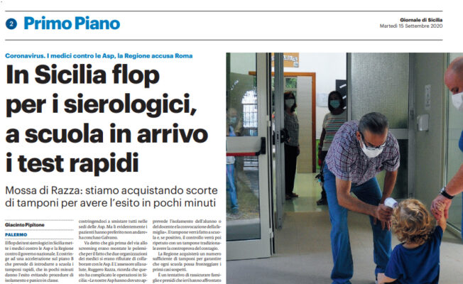 Gds: “In Sicilia flop per i sierologici, a scuola in arrivo i test rapidi. Mossa di Razza “Stiamo acquistando scorte di tamponi per avere l’esito in pochi minuti”