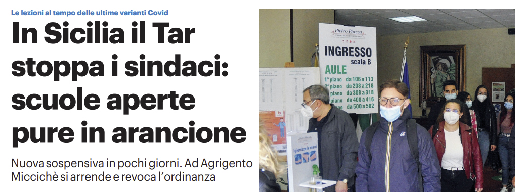 Gds: “In Sicilia il Tar stoppa i sindaci: scuole aperte pure in arancione”