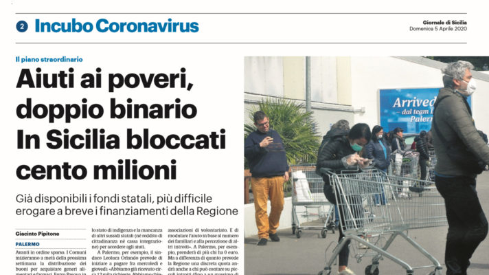 L’edizione odierna del “Giornale di Sicilia” si sofferma sugli aiuti ai poveri. A Palermo, Orlando prevede di iniziare a pagare fra mercoledì e giovedì «Abbiamo già ricevuto circa 12 mila richieste. Abbiamo chiesto a 5 mila persone di integrare la domanda. Tutti gli altri dovranno inviarci un’autocertificazione. Non appena la riceveremo caricheremo sulle app dei loro telefonini i soldi». A quel punto i cittadini potranno recarsi in uno dei negozi o supermercati convenzionati o presso le associazioni di volontariato. L’elenco completo si trova sui siti di ogni Comune. Per i primi 45 milioni non ci saranno vincoli, a differenza dei 100 milioni stanziati da Musumeci. Ieri l’assessore alla Famiglia, Antonio Scavone, ha annunciato che «entro martedì verranno erogati i primi 30 milioni ai sindaci. In più nelle casse dei comuni siciliani ci sono altri 20 milioni del fondo nazionale delle politiche sociali 2013-2015 non utilizzati e che invece potrebbero servire per potenziare la rete di solidarietà».