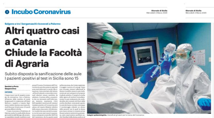 Gds: “Incubo Coronavirus. Altri quattro casi a Catania, chiude la Facoltà di Agraria. A Palermo…”