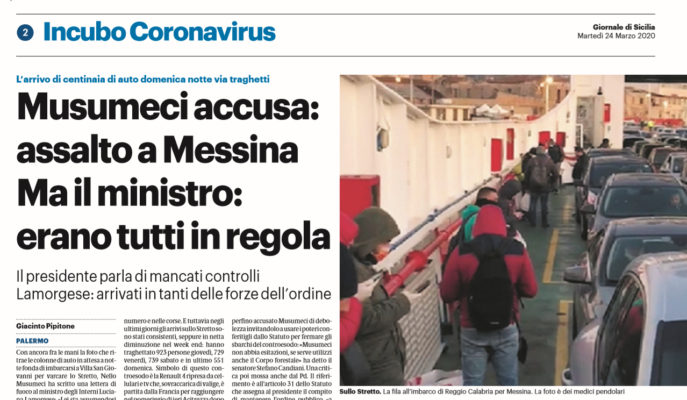 Gds: “Incubo Coronavirus. Musumeci accusa: «Assalto a Messina». Ma il ministro: «Erano tutti in regola». In Sicilia è in arrivo il temuto picco”