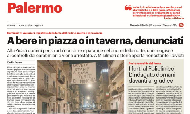 Gds: “Incubo Coronavirus. Palermo. A bere in piazza o in taverna, denunciati. Alla Zisa 5 uomini per strada con birre e patatine nel cuore della notte, uno reagisce ai controlli dei carabinieri e viene arrestato”