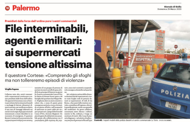 Gds: “Incubo Coronavirus. Palermo. File interminabili, agenti e militari: ai supermercati tensione altissima. Il questore Cortese: «Comprendo gli sfoghi ma non tollereremo episodi di violenza»”