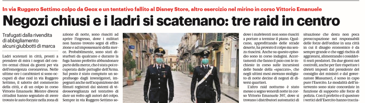 L’edizione odierna del “Giornale di Sicilia” si sofferma sui furti nel centro di Palermo. Ladri scatenati in città, pronti a prendere di mira i negozi del centro ormai chiusi da giorni per via dell’emergenza Coronavirus. Nelle ultime ore i carabinieri si sono occupati di due raid in via Ruggero Settimo, il salotto del commercio della città, e di un colpo in corso Vittorio Emanuele. Mentre diversi cittadini hanno segnalato di avere trovato le auto forzate nella zona di viale Strasburgo. Un reato, quello dei furti sulle macchine parcheggiate, che sembrava tramontato ma che la dice lunga su come le difficoltà economiche legate alla crisi sanitaria spingano in tanti ad «arrangiarsi». In via Ruggero Settimo i ladri sono riusciti a portare via 35 giubbotti esposti all’interno del negozio «Geox». I banditi sono entrati in azione di notte, sono riusciti ad aprire l’ingresso, dove i militari non hanno trovato segni di effrazione e ad impossessarsi della merce. Sempre in via Ruggero Settimo sono stati trovati segni di effrazione all’ingresso del negozio «Disney», dove i malviventi non sono riusciti a portare a termine il piano. Qualcuno, approfittando delle strade deserte, ha provato il colpo ma senza riuscirsi. Anche su questo episodio sono in corso indagini. L’altro raid notturno è stato messo a segno venerdì notte in corso Vittorio Emanuele 397, dove si trovano i distributori automatici di snack e bevande. I malviventi si sono messi all’opera per scardinare le macchinette e prendere il danaro. Magro il bottino: appena 40 euro. Anche in questa circostanza, sono intervenute le pattuglie dei carabinieri.