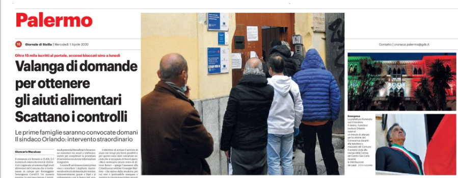 Gds: “Incubo Coronavirus. Palermo. Oltre 15 mila iscritti al portale, accessi bloccati sino a lunedì. Valanga di domande per ottenere gli aiuti alimentari. Scattano i controlli”