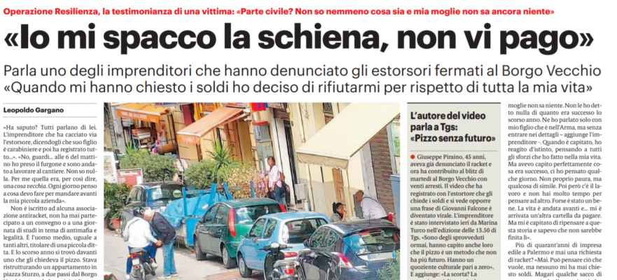L’edizione odierna del “Giornale di Sicilia” riporta le dichiarazioni di un imprenditore che ha denunciato gli estorsori al Borgo Vecchio: «Quando mi hanno chiesto i soldi ho deciso di rifiutarmi per rispetto di tutta la mia vita»