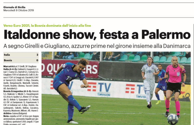 L’edizione odierna del “Giornale di Sicilia” si sofferma sulla sfida di calcio femminile tra Italia e Bosnia, andata in scena ieri a Palermo. La nazionale azzurra si è imposta 2-0, mantenendo la scia della Danimarca in vetta al Girone B. Al “Barbera” presenti sugli spalti Mirri, Castagnini e Paparesta. La selezione di Milena Bertolini ha sbloccato il risultato con Girelli. Il raddoppio arriva poco prima della mezz’ora con Giugliano, che poi ha l’occasione per chiudere la gara in avvio di ripresa. La corsa all’Europeo vede ancora le azzurre in vetta.