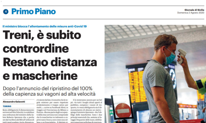 L’edizione odierna del “Giornale di Sicilia” si sofferma sulla decisione del ministro della Salute Roberto Speranza di bloccare il via libera alla possibilità di usufruire del 100% dei posti all’interno dei treni. “Non possiamo permetterci di abbassare il livello di attenzione e cautela – spiega il ministro accogliendo le preoccupazioni di esperti ed enti locali – È giusto che sui treni restino in vigore le regole di sicurezza applicate finora”.