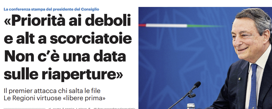 L’edizione odierna del Giornale di Sicilia si occupa delle parole del Premier Draghi ieri in conferenza stampa: «Con che coscienza la gente salta la fila?». La mette giù dura, Mario Draghi.