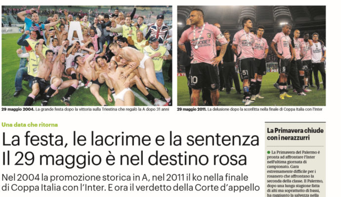 L’edizione odierna del “Giornale di Sicilia”, parla di una data ricorrente nella storia rosanero: il 29 maggio. Nel 2019, il Palermo non cercherà una vittoria sul campo, ma in sede di giustizia sportiva. Il 29 maggio ricorda il giorno della promozione in serie A dopo la rifondazione e anche la finale di Coppa Italia giocata a Roma contro l’Inter. La partita adesso si chiama Serie C. Anche l’arrivo in Europa del Palermo passa dal 29 maggio 2005, data in cui i rosa chiusero il campionato al sesto posto da neopromossi. La storia del Palermo rimane fortemente legata alla partita che ha posto fine a un purgatorio durato 31 anni, la sfida contro la Triestina che diede l’aritmetica promozione in serie A alla squadra rosanero. Dalla finale di Coppa Italia dunque, si arriva fino alla sentenza che può spedire il Palermo in serie C, con un’analogia, Delio Rossi in panchina. Quel 29 maggio, il suo Palermo smise di esistere, tra quattro giorni si vedrà che sorte toccherà stavolta al club.