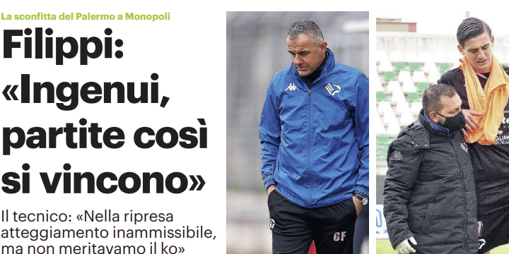 Gds: “La sconfitta del Palermo a Monopoli. Filippi «Ingenui, partite così si vincono»”