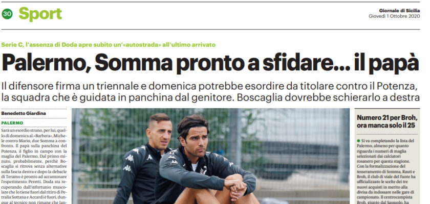 L’edizione odierna del “Giornale di Sicilia” si sofferma su Michele Somma, nuovo difensore del Palermo. E’ pronto all’esordio contro il Potenza, squadra guidata da suo padre Mario. Boscaglia si ritrova senza alternative sulla fascia destra ed è pronto ad accantonare l’esperimento Peretti. Doda è in fase di riatletizzazione, ma non verrà rischiato.
