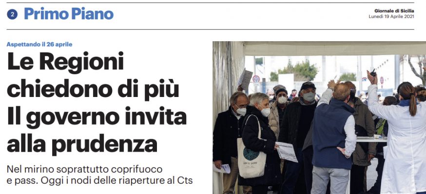 L’edizione odierna del “Giornale di Sicilia” si sofferma sui dissidi Governo-Regioni per quanto riguarda le restrizioni anti-Covid 19.