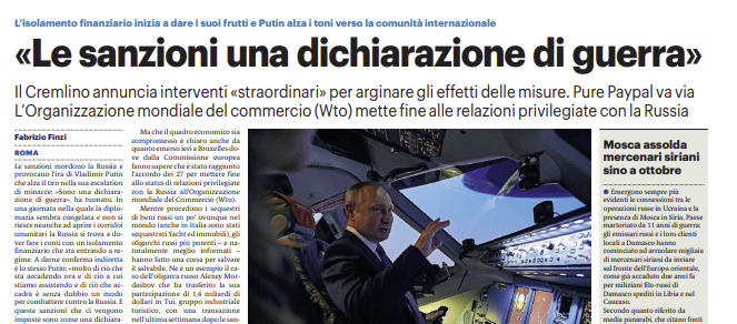 Gds: “L’isolamento finanziario inizia a dare i suoi frutti e Putin alza i toni verso la comunità internazionale: «Le sanzioni una dichiarazione di guerra»”