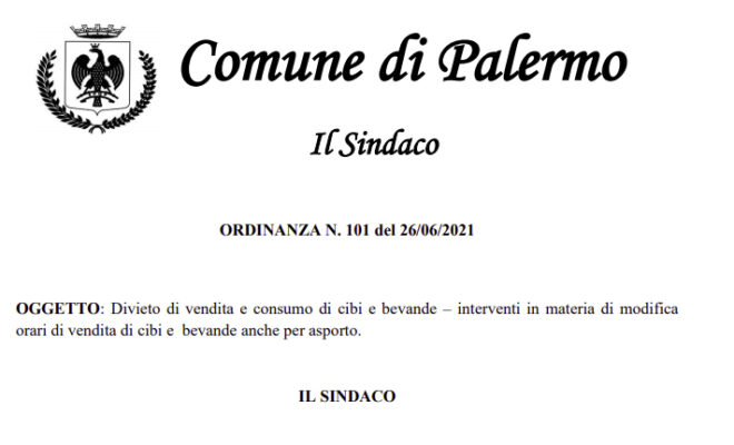 “Il sindaco Leoluca Orlando ha emanato oggi (ieri) anche l’ordinanza n.101 con la quale conferma integralmente l’Ordinanza Sindacale n. 92 del 11/06/2021 – (Divieto di somministrazione e vendita di bevande in bottiglie di vetro o altri materiali il cui utilizzo improprio risulta idoneo a minacciare la incolumità personale)