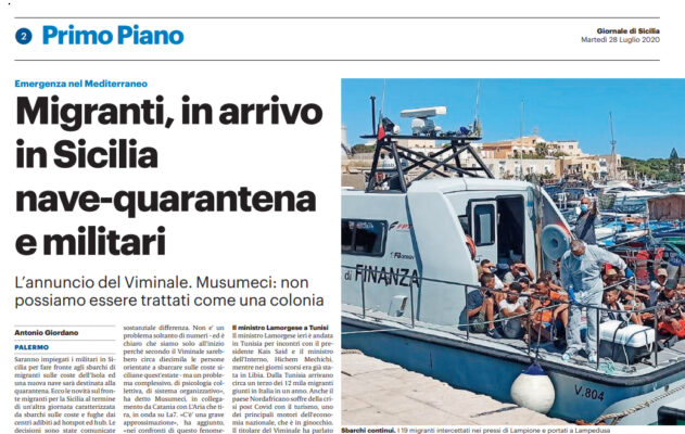 L’edizione odierna del “Giornale di Sicilia” parla dell’arrivo in Sicilia della nave-quarantena e dei militari per far fronte agli sbarchi. Le