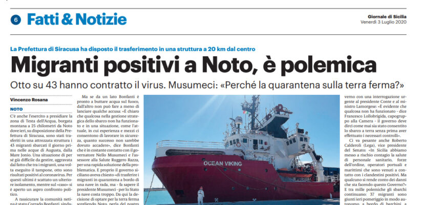 L’edizione odierna del “Giornale di Sicilia” parla dei migranti positivi al Coronavirus vicino Noto. «Non ci deve essere nessuna preoccupazione