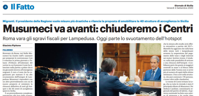 L’edizione odierna del “Giornale di Sicilia” si sofferma sul problema hotspot. Musumeci risponderà a Conte con un provvedimento con cui proporrà al ministero la chiusura definitiva di tutti gli hotspot e dei 40 centri di accoglienza sparsi in Sicilia.