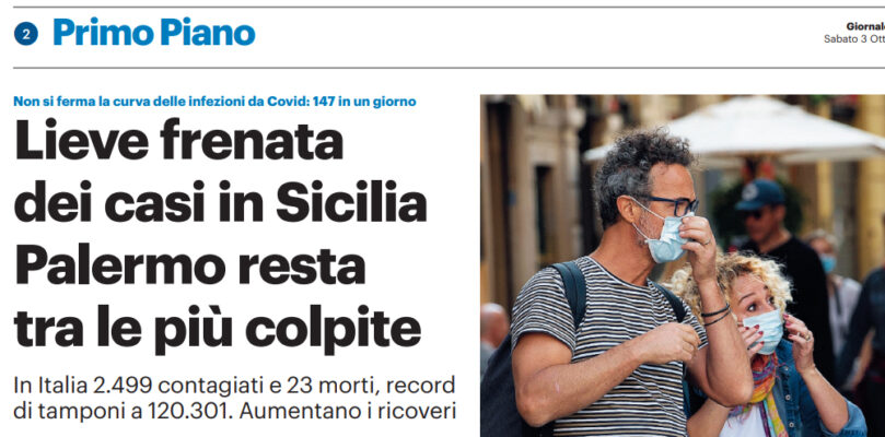 Gds: “Non si ferma la curva delle infezioni da Covid, 147 in un giorno. Lieve frenata dei casi in Sicilia. Palermo resta tra le più colpite”