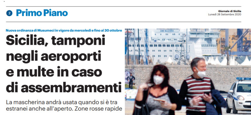 L’edizione odierna del “Giornale di Sicilia” si sofferma sulla nuova ordinanza di Musumeci. Obbligo di tampone per chiunque arrivi in aereo da un Paese straniero e multe in caso di assembramenti. E’ previsto anche l’uso della mascherina all’aperto. Ancora più articolata è la stretta su pub e ristoranti, aumentato il numero di forze dell’ordine per controllare chi staziona fuori creando assembramenti.