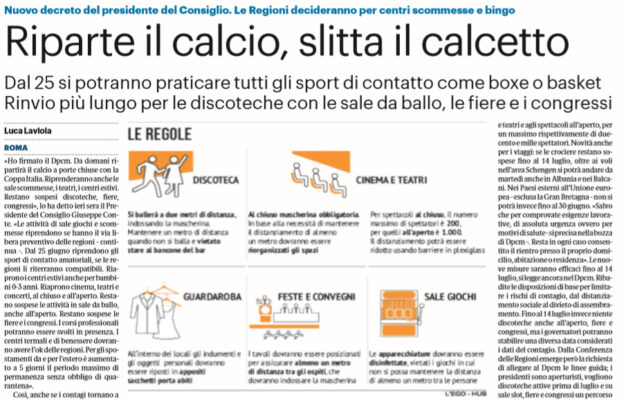 L’edizione odierna del “Giornale di Sicilia” si sofferma sul nuovo decreto del Presidente del Consiglio Conte «Ho firmato il Dpcm. Da domani ripartirà il calcio a porte chiuse con la Coppa Italia. Riprenderanno anche le sale scommesse, i teatri, i centri estivi. Restano sospesi discoteche, fiere, congressi». Dal 25 giugno riprendono gli sport di contatto amatoriali. Riaprono anche i centri estivi per bambini 0-3 anni, cinema, teatri e concerti.
