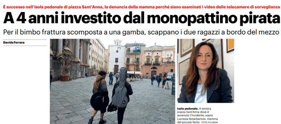 L’edizione odierna de “Il Giornale di Sicilia” si sofferma su un bambino di 4 investito da un monopattino.