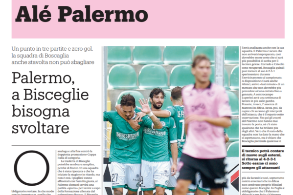 L’edizione odierna del “Giornale di Sicilia” si sofferma sulla sfida fra Bisceglie e Palermo. E’ obbligatorio svoltare, la classifica piange, la vetta è già lontana, ma il campionato è lungo.