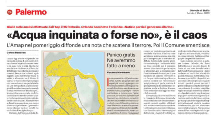 L’edizione odierna del “Giornale di Sicilia” si sofferma sul caso acqua a Palermo. L’acqua oggi più che mai presidio naturale alla portata di tutti contro il virus, diventa improvvisamente vietata in quasi tutta la città. Quella che esce dai nostri rubinetti è, di fatto, dal 25 febbraio «non idonea al consumo umano». Dentro due serbatoi, a galleggiare, sono state trovate tracce di solfati e alluminio, ma il divieto di usarla è arrivato solo ieri pomeriggio con una ordinanza lampo del sindaco. Che però parla di allarmismo ingiustificato ed entra a gamba tesa sullo stop, confondendo ancora di più… le acque. Giornata convulsa, tra divieti ufficiali e ridimensionamenti tardivi e un ribaltone prima della mezzanotte: l’acqua torna ai livelli di conformità, quindi l’ordinanza sarà già revocata oggi con effetto immediato. Risultato: oltre ai disagi, la nuova psicosi, con panico e ressa nei supermercati. Questa volta niente cibo per mesi nei carrelli, ma confezioni di bottiglie di acqua. Partiamo dall’inizio e cioè dal documento ufficiale dell’Amap . «A seguito alle analisi effettuate dall’Asp 6 – si legge – si informa che è inibito, fino a diversa comunicazione, l’uso delle acque distribuite dai serbatoi Petrazzi Alto e Basso per il consumo umano». Perché tanto tempo per fare scattare l’allarme? L’ingeribilità dell’acqua erogata nelle abitazioni che occupano un vastissimo perimetro, da Mondello alla Noce, è arrivata come un fulmine a ciel sereno su una città già in emergenza per le restrizioni e il difficile rispetto delle cautele igieniche anti contagio. L’ordinanza inibisce l’uso potabile per il consumo umano, come bevanda, per le imprese alimentari, per la reidratazione e ricostituzione di alimenti; per la preparazione di alimenti e bevande in cui l’acqua costituisca ingrediente o entri in contatto con l’alimento per tempi prolungati; per le pratiche di igiene personale che comportino ingestione, anche se limitata, di acqua come ad esempio il lavaggio dei denti e del cavo orale. Tanto rumore per poco o nulla, per Leoluca Orlando che poi ieri sera esprimeva soddisfazione per l’esito positivo della vicenda che aveva prima aspramente criticato parlando di «procurato allarme»: «La firma dell’ordinanza è un atto dovuto di fronte ad una nota formale inviata dall’Asp all’Amministrazione – aveva detto il sindaco – ma tutti i dati relativi alla qualità dell’acqua distribuita ne confermano la potabilità e la qualità per uso umano. Da tutti gli esami eseguiti in tutti i punti di presa e per tutti i giorni verificati risulta che non vi è alcun problema di carattere microbiologico nell’acqua distribuita nella rete». «Specialmente in una situazione di già grave nervosismo legato alla situazione sanitaria del paese – aveva aggiunto – è auspicabile che da parte dei soggetti istituzionali vi sia la massima collaborazione per non alimentare psicosi di alcun genere. Non possono essere diffuse notizie parziali che generano allarme nella popolazione».
