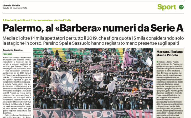 L’edizione odierna del “Giornale di Sicilia” si sofferma sui numeri da Serie A del “Barbera”. Il 2019 ha portato più spettatori allo stadio rispetto al 2018 e al 2017, con i rosa stabilmente in Serie B: 14.224 presenti a partita, solo per quanto riguarda le gare di campionato, tra abbonati e paganti, in tutto l’anno solare. Una media che sale a 14.837 spettatori se si prende in esame solamente questa prima metà di stagione vissuta in Serie D. Numeri da record per la categoria, che proietterebbero il Palermo in una realtà più vicina alla massima serie che al calcio dilettantistico. L’anno è iniziato con i soli 6.674 spettatori di Palermo-Salernitana, quando i rosa erano primi in Serie B con cinque punti di vantaggio dalle inseguitrici. L’epilogo lo conosciamo tutti, ma da lì alla fine del campionato, i palermitani sono accorsi in massa in almeno due occasioni: in casa contro il Brescia (15 febbraio, 22.329 spettatori) e all’ultima giornata contro il Cittadella (11 maggio, 28.351 presenti). L’ultima partita nella storia dell’U.S. Città di Palermo, che nel giro di due mesi ha lasciato spazio alla Ssd Palermo. Il Palermo non chiudeva un anno solare con oltre 14 mila spettatori di media dal 2016, l’anno del sold out di Palermo-Verona per l’ultima salvezza in Serie A della storia. In quel caso, l’anno si chiuse con 15.570 presenti a partita. L’anno passato si chiuse con 11.274 spettatori di media, circa tremila presenti a partita in meno rispetto a quanto riesce a fare il Palermo in Serie D. Quest’anno, tra i dilettanti, il Palermo non è mai andato sotto i 14 mila spettatori, fatta eccezione per la sfida di Coppa Italia col Biancavilla, e in una proiezione a scala nazionale, il «Barbera» è il diciannovesimo stadio italiano per media di pubblico in campionato.