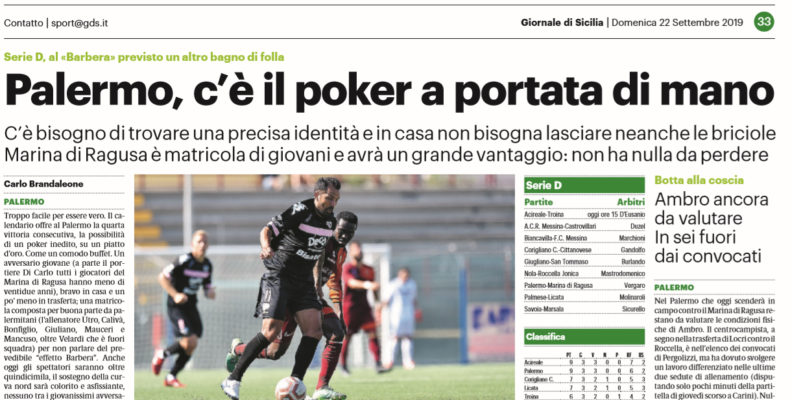 Gds: “Palermo, c’è il poker a portata di mano. Oltre 15 mila spettatori al Barbera per battere il Marina di Ragusa”