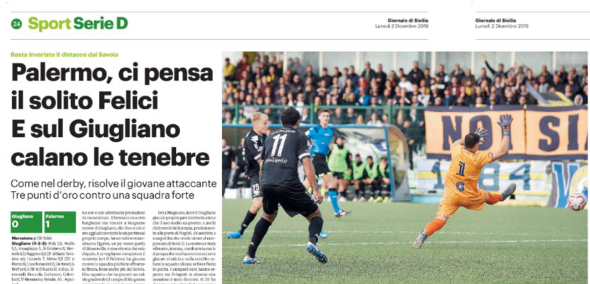 L’edizione odierna del “Giornale di Sicilia” si sofferma sulla prestazione di Mattia Felici, match winner della sfida contro il Giugliano. Ancora lui, “u picciriddu”. Il più piccolo tra i rosa in campo regala al Palermo altri tre punti preziosi. Il Savoia resta a otto lunghezze, ma vincere a Mugnano ha un valore straordinario. La contesa è stata vibrante, intensa, combattuta ma le due squadre mai hanno rinunciato a giocare al calcio e nulla avrebbe rubato la squadra di casa se fosse finita in parità. I campani non hanno segnato ma Pelagotti in almeno due occasioni è stato decisivo. Al 26′ ha deviato una bordata forte e angolata di De Vena e al 44′, mettendo in corner un’altra battuta ravvicinata sempre di De Vena. Come detto la differenza l’ha fatta Felici, forse l’unico vero talento in campo, che con le sue accelerazioni e le sue sterzate ha messo alla berlina i difensori locali e soprattutto il giovanissimo Mennella. La gara è stata intensa, nella ripresa Agovino ha ridisegnato il suo attacco arretrando Orefice, avanzando Alvino largo a destra e portando Caso Naturale a sinistra. E per un po’ i rosa hanno sbandato; Martin, già ammonito, ha dovuto allentare un po’, Ambro è sembrato confuso e pressava senza vedere mai la palla, lo stesso Kraja (che nel primo tempo s’era reso insidioso con un colpo di testa finito di poco fuori) ha mostrato segnali di stanchezza. Sesta vittoria su sette trasferte senza mai prendere un gol dagli avversari (l’unica rete subita è stata l’autogol di Crivello a Biancavilla), forse non è esagerato dire che il Palermo sta costruendo la promozione lontano dal «Barbera».