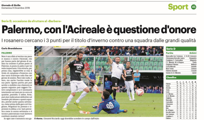 L’edizione odierna del “Giornale di Sicilia” si sofferma sulla sfida tra Palermo e Acireale. Una vittoria regalerebbe ai rosa il titolo di campione d’inverno. Inoltre, si potrà stabilire con chiarezza se questo organico potrà reggere l’intero campionato o se è necessario intervenire sul mercato. Infine, questa sfida può dare indicazioni sul modulo più idoneo a questa squadra, considerando che in settimana Pergolizzi ha provato la difesa a tre. Si annuncia una gara diversa da tutte le altre viste al “Barbera”, perché sul piano individuale l’Acireale ha qualcosa in più di tutte le altre avversarie affrontate dai rosa. L’argentino giramondo Nicolas Rizzo meriterebbe altre categorie, il catanese Savanarola e Sicignano hanno esperienza da vendere, Diop non ha fatto male a Siracusa. E’ dall’inizio della stagione che tecnici e dirigenti acesi dicono di non essere inferiori al Palermo. E oggi vorranno dimostrarlo. Quasi un punto d’onore.