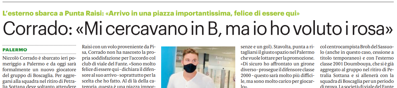 L’edizione odierna del “Giornale di Sicilia” riporta le dichiarazioni del nuovo acquisto rosanero Niccolò Corrado: «Sono molto felice di essere qui – dichiara il difensore al suo arrivo – soprattutto per la scelta che ho fatto. Al di là della categoria, questa è una piazza importantissima. Nonostante mi avessero chiamato diverse società di Serie B, questa era la piazza più importante».