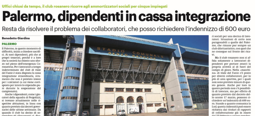 L’edizione odierna del “Giornale di Sicilia” parla del Palermo, che in questo momento di difficoltà, inizia a chiedere sacrifici ai suoi dipendenti. Per i lavoratori a tempo indeterminato – si legge -, è stata disposta la cassa integrazione straordinaria, strumento che non è previsto per i calciatori. Al momento sarebbero in cinque già in cassa integrazione, c’è chi porta il lavoro da casa e c’è anche chi ha dovuto consegnare ai giocatori le cyclette per continuare gli allenamenti. Anche il Napoli in serie A ha fatto così per ben trenta dipendenti. Il club rosanero – prosegue il quotidiano – ha anche diversi collaboratori di area sportiva, per i quali non sono previste misure di questo genere. Anche per loro in questo periodo non c’è possibilità di lavorare, ma per effetto di quanto previsto dal decreto dello scorso 17 marzo, possono richiedere un’indennità di 600 euro.