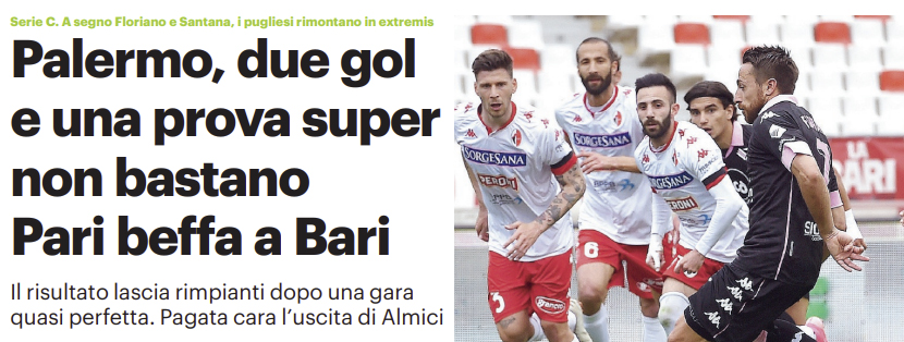 Gds: “Palermo, due gol e una prova super non bastano. Pari beffa a Bari”