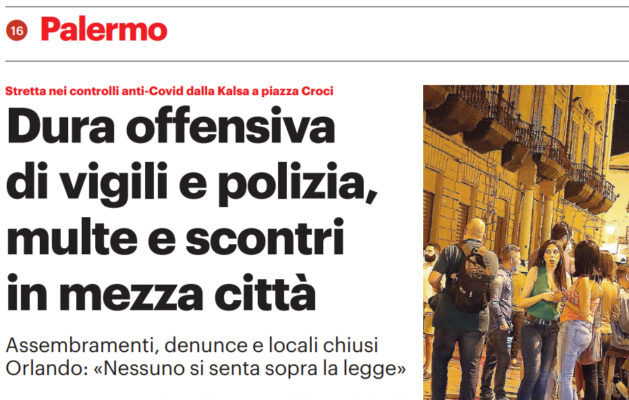 Gds: “Palermo. Dura offensiva di vigili e polizia, multe e scontri in mezza città. Assembramenti, denunce e locali chiusi. Orlando «Nessuno si senta sopra la legge»”