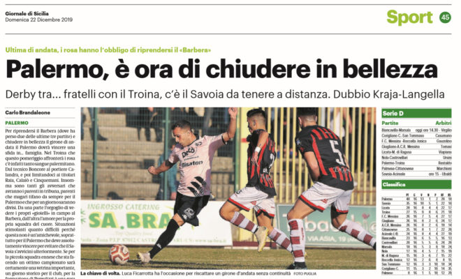 L’edizione odierna del “Giornale di Sicilia” si sofferma sulla sfida tra Palermo e Troina. I rosanero affronteranno una squadra con tanti palermitani, dal tecnico Boncore al portiere Calandra, e poi limitandoci ai titolari Raia, Calaiò e Cinquemani. Se per la piccola squadra ennese sarà una vetrina importante, per la formazione di Pergolizzi è una gara di vitale importanza. Il Palermo deve riprendersi il Barbera, perché è proprio sul campo casalingo che ha perso le uniche due partite. Il Troina cambierà modulo e passerà al 3-5-2, lo stesso schema adottato da Savoia e Acireale. Difesa forte, centrocampo compatto e tanto contropiede. I rosanero dovranno inventarsi qualcosa in attacco e Ficarrotta potrebbe essere la chiave per aprire la pota del Troina.