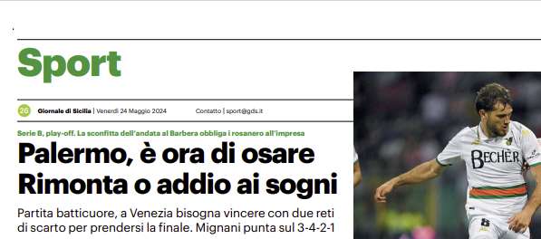 Il Palermo è consapevole della difficoltà dell’impresa, ma il calcio è uno sport dove la determinazione e la volontà possono sovvertire i pronostici. La squadra di Mignani dovrà giocare con coraggio, attaccare fin dall’inizio e cercare di sorprendere il Venezia. La speranza è di raggiungere una finale che, solo qualche settimana fa, sembrava lontana, ma che ora è a portata di mano con una prestazione perfetta.